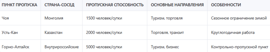 Ключевыми пунктами пропуска являются Чоя на границе с Монголией и Усть-Кан на границе с Казахстаном. Через эти пункты осуществляется основной поток туристов, товаров и услуг. В 2024 году через пограничные переходы Республики Алтай было пропущено более 500 тысяч человек и 150 тысяч транспортных средств, что на 25% больше, чем в предыдущем году.