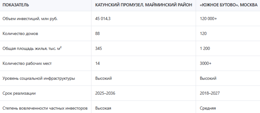 Как видно из таблицы, проект в Республике Алтай отличается высокой степенью вовлеченности частного капитала и уникальной моделью комплексного освоения в условиях сельского и пригородного пространства. Это делает его перспективным для масштабирования и привлечения дополнительных инвестиций.