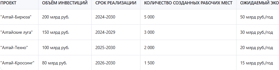 Стратегия развития Республики Алтай до 2030 года открывает широкие инвестиционные возможности для бизнеса различных масштабов. Каждый из ключевых проектов требует значительных капиталовложений, что делает их привлекательными для частных инвесторов.