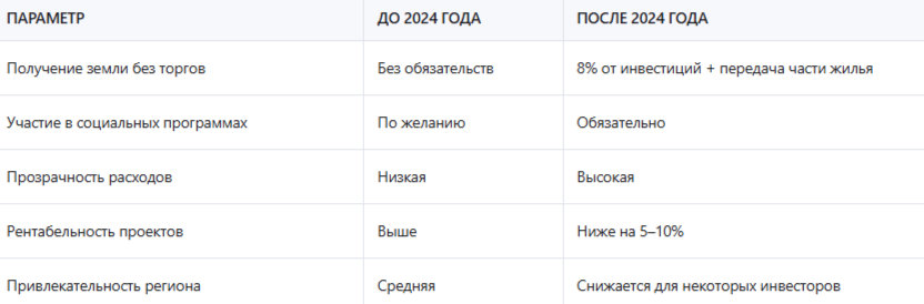 Согласно новым правилам, инвесторы, которые получили землю без торгов, теперь обязаны выполнять два ключевых условия. Первое — направлять в бюджет региона не менее 8% от объема привлеченных инвестиций. Второе — передавать муниципалитету определенную долю построенного жилья. Это касается как жилых, так и коммерческих проектов, реализуемых на льготных условиях.
