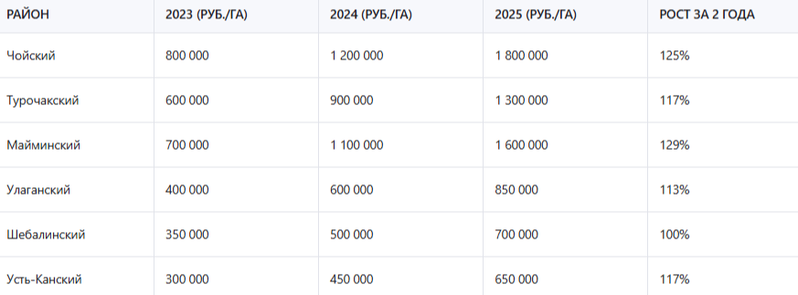 Таблица: Динамика цен на землю в разных районах Республики Алтай (2023–2025)