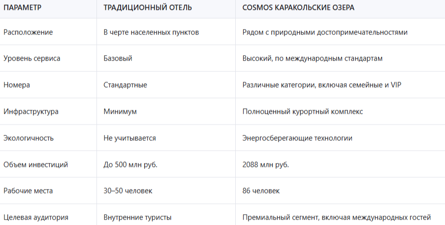 Такое сравнение показывает, что Cosmos Каракольские Озера — это не просто модернизация существующей инфраструктуры, а полное обновление концепции курортного отдыха в России. Проект ориентирован на привлечение не только внутреннего, но и международного туриста, что открывает новые возможности для развития региона.
