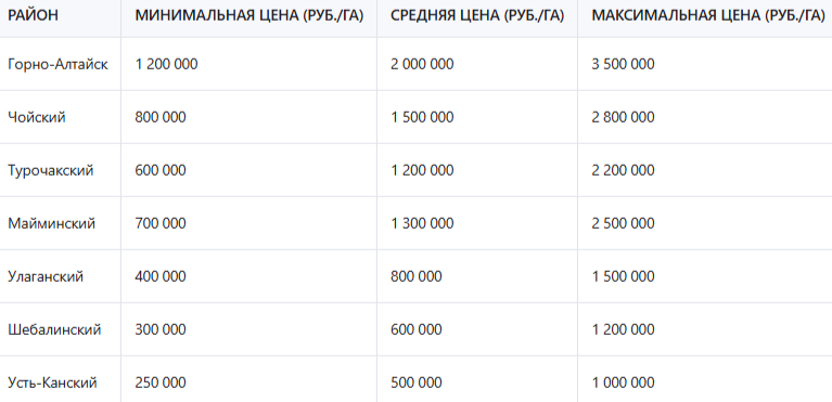 Таблица: Сравнение стоимости земли по районам Республики Алтай (2025)